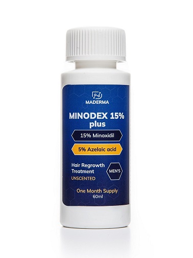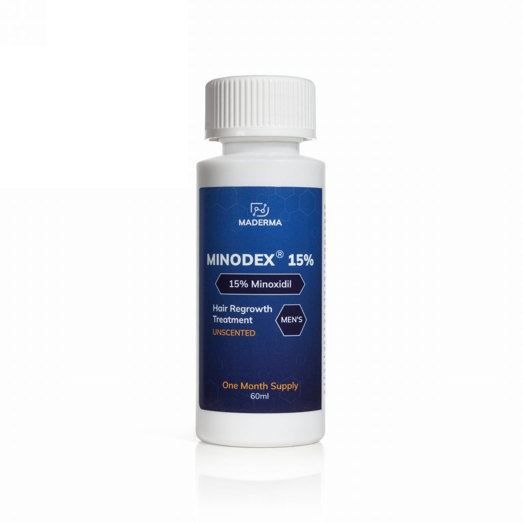 —  Men’s Minodex Extra Strength Unscented 15% Minoxidil Topical Solution with azelaic acid to help treat hair loss, maintain hair density and allow for the regrowth of fuller hair.